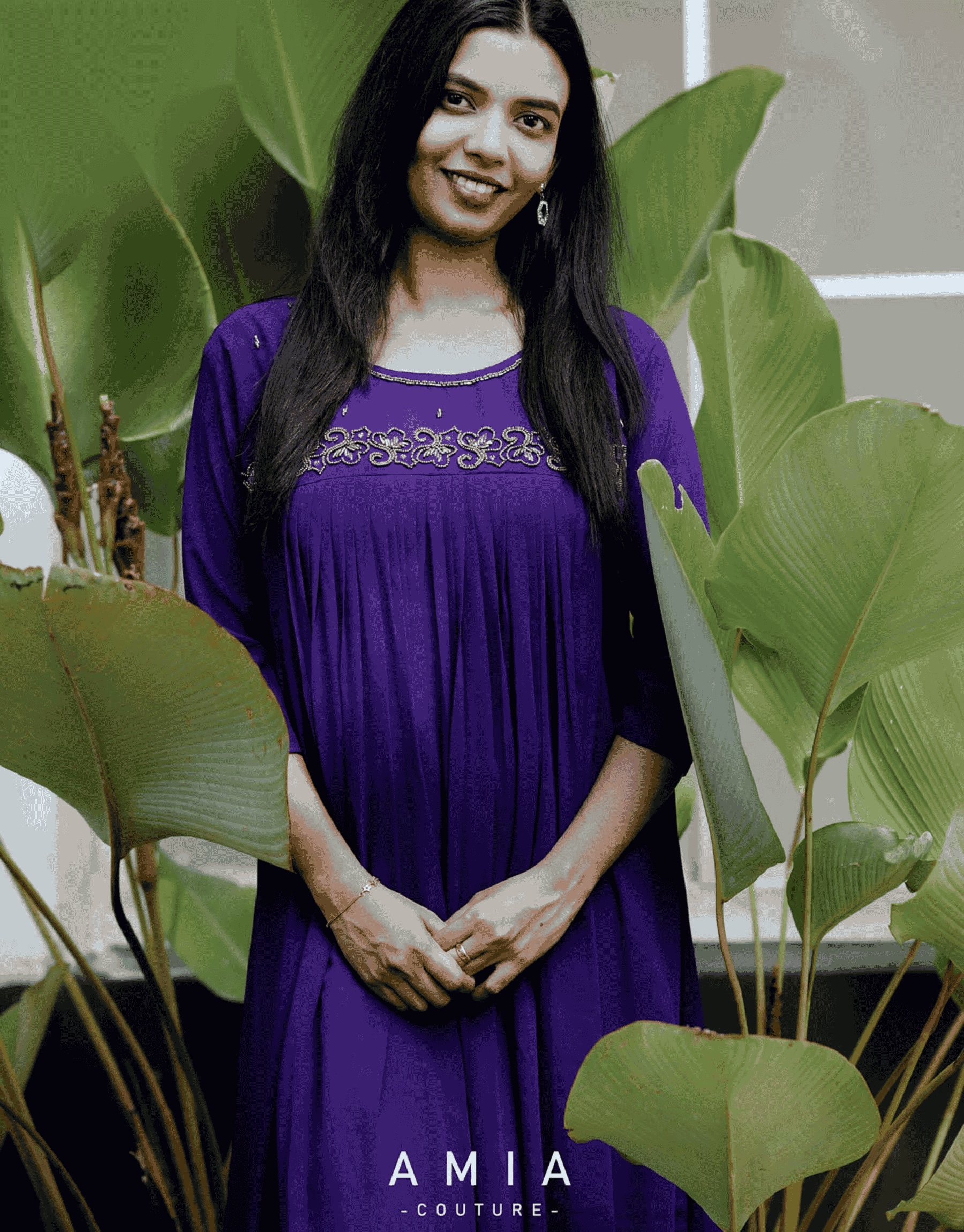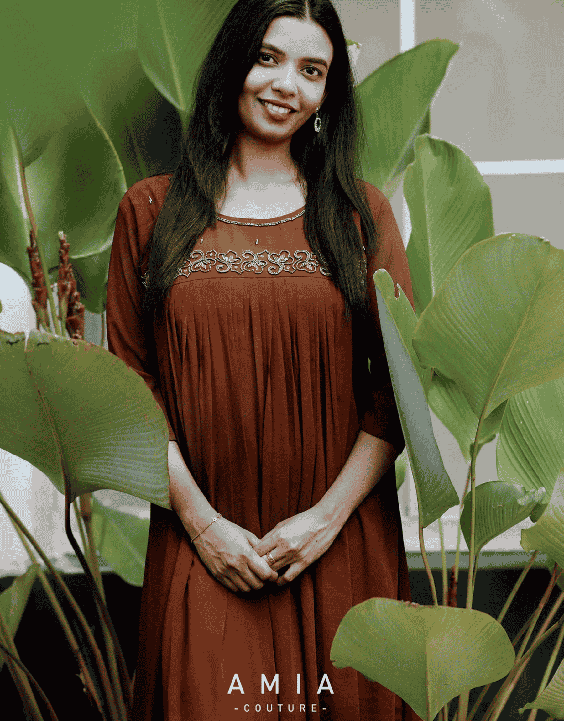 This elegant rust-brown and Blue maternity or empire-waist tunic by Amia Couture blends sophisticated craftsmanship with a relaxed, flattering silhouette. The garment is crafted from a fluid, lightweight fabric that drapes beautifully, featuring a distinctive yoke design embellished with intricate, shimmering silver-toned embroidery and beadwork. Below the embroidery, delicate micro-pleats create a gathered effect, providing ample volume and comfort through the midsection, making it an ideal choice for both maternity wear and elevated everyday style.